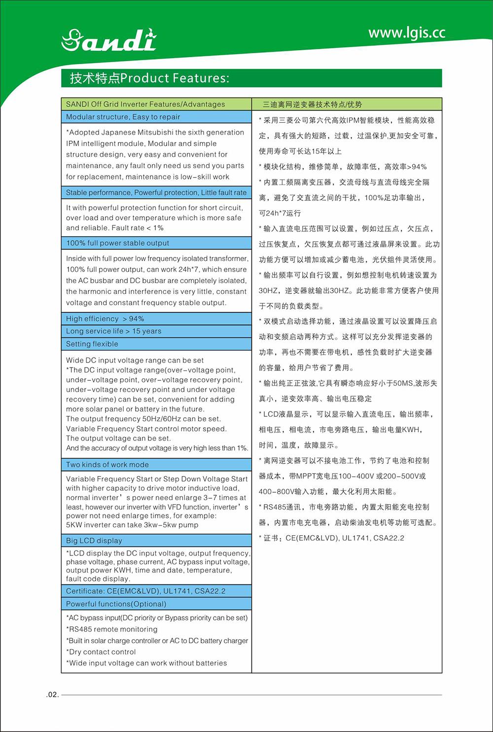 我们公司开发的工频离网逆变器是一种电源装置,可通过全桥逆变器将直流电变换为交流电。该系列产品可满足3kw-500kw功率负载的使用,输出波形为正弦波,有着健全的保护功能,整机效率达到94%,空载损耗低,可提供多能量功率为无电山区,牧区,边疆,岛等电网停电,电网电压不稳定的地区提供解决方案。产品人性化设计,大方外观,操作方便,液晶显示直观,工作稳定,无噪声,无噪声。输出正弦波ac适用于大多数工业电器和家电,例如:各种电动工具,马达,抽水机,汽车/轮船,空调机,压缩机,冰箱,洗衣机,电视,风扇等主要根据电源控制系统的属性和要求开展设计和制造,适于电源控制系统的可靠性控制要求用以电源装置,可以满足电源控制系统中各种终端装置的需要,也适用于其他稳定的交流输电电压。